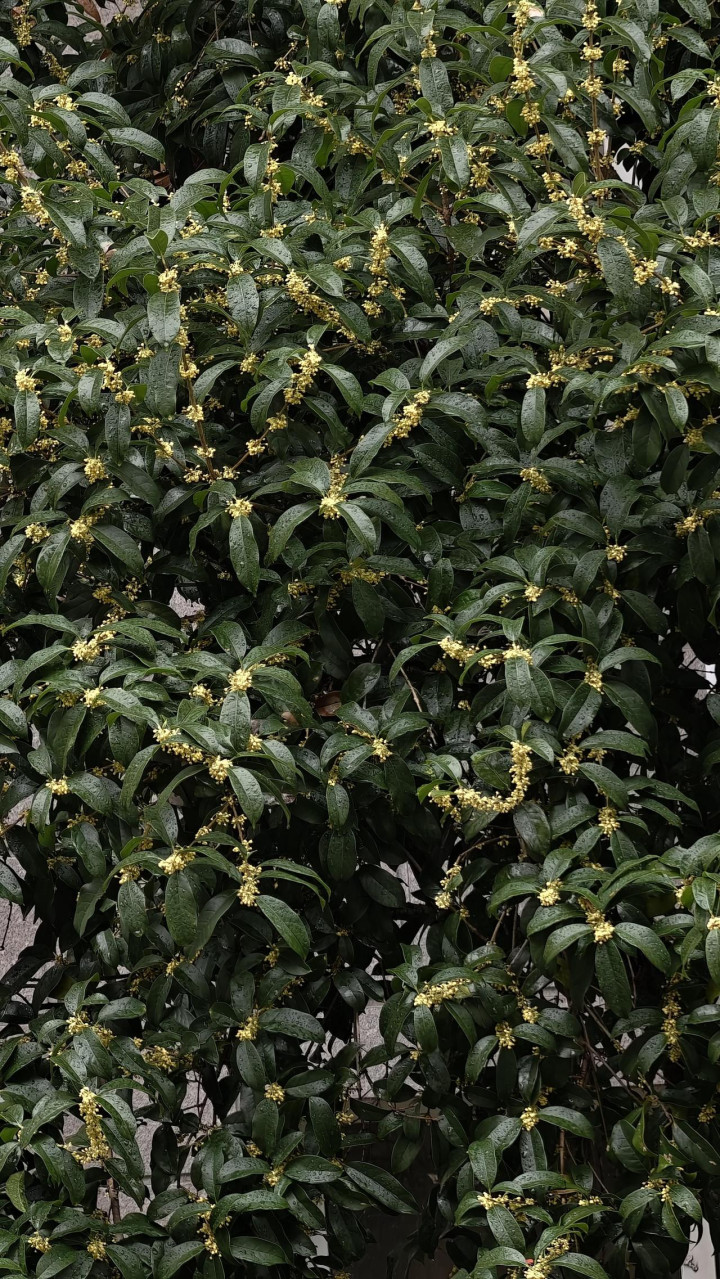 今年反常的气温,让桂花在该开的时候,没有如期绽放,该开的桂树满树的花苞,在炎热的气温中,全都隐身于树枝间。杭州的秋天,一直都是因突然的凉风冷雨,一夜进入的。今年也是如此,一夜的风雨后,一步进入了深秋。正是因为气温的猛然降低,桂花树满树的花苞,便一下子都探身于枝上,攒足了劲儿同时炸开。不再是零星几点的开,而是成团成簇的“爆发式”绽放。