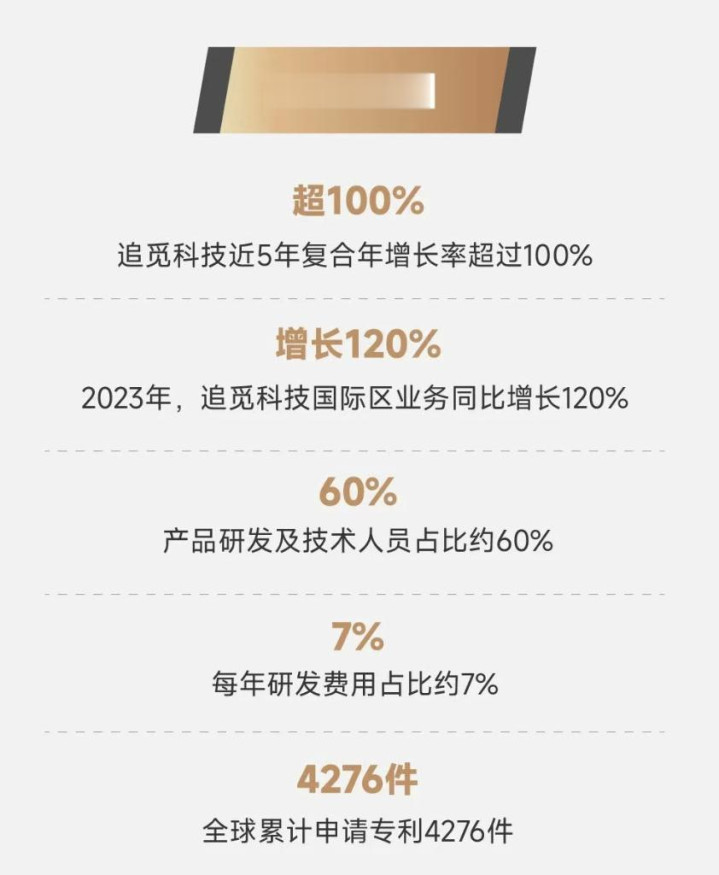 在追觅官方发布的最新校招海报介绍中,追觅产品研发及技术人员占比约60%,每年研发费用占比约7%,截至6月30日全球累计申请专利6379件。