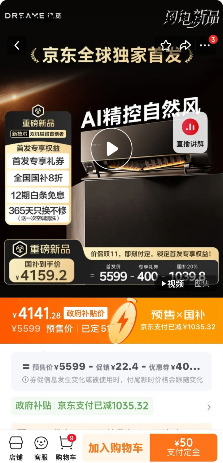 比如正在京东首发的机械臂空调,10月27日前可付50元定金预订。10月13日,有意思报告查看首发价5599元、国补到手价约4159元的机械臂空调旗舰款的预订数为51,价格略低的高端款预订数则为21,目前预订数字已不可见。